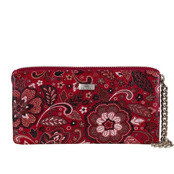 Ręcznie szyty portfel damski BajuBaj w czerwonym kolorze. Duży, skórzany, z ochroną RFID i ozdobnym łańcuszkiem. Pomieści 6–12 kart, banknoty i drobiazgi.
