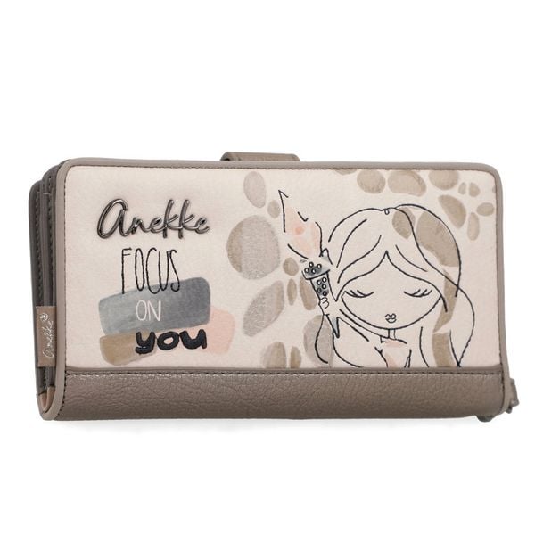 Portfel damski Anekke, z efektownym nadrukiem i metalowym logo zamykany na klapę wyposażony w przegrody na banknoty kieszeń na monety oraz liczne miejsca na karty funkcjonalny i wygodny w codziennym użytkowaniu, beżowy, 42749-901