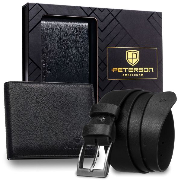 Zestaw prezentowy: skórzany, poziomy portfel męski w czarnym kolorze z systemem RFID i pasek ze skóry ekologicznej – Peterson