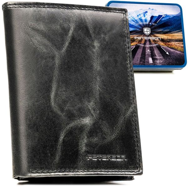 Pionowy, skórzany portfel męski w czarnym kolorze bez zapięcia zewnętrznego – Peterson