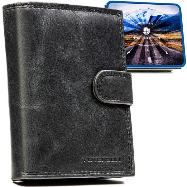 Pionowy portfel męski ze skóry naturalnej w czarnym kolorze zamykany na zatrzask – Peterson