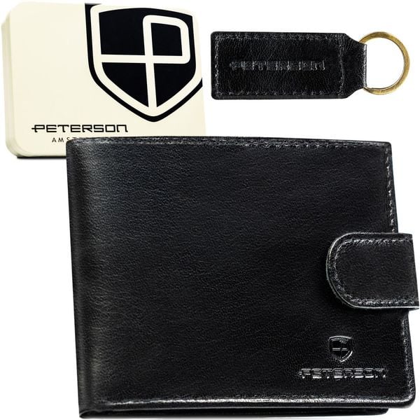 Zestaw prezentowy: czarny, skórzany portfel męski bez zapięcia i brelok - Peterson