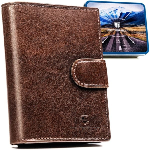 Pionowy portfel męski ze skóry naturalnej w brązowym kolorze zamykany na zatrzask - Peterson
