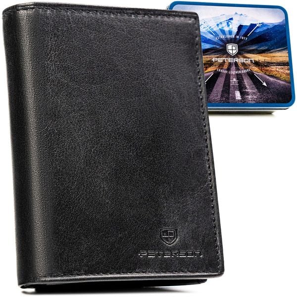 Pionowy, skórzany portfel męski w czarnym kolorze bez zapięcia zewnętrznego - Peterson