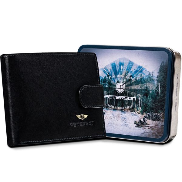 Czarny, duży portfel męski wykonany ze skóry naturalnej i zamykany na zatrzask - Peterson