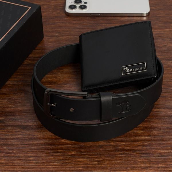 Zestaw prezentowy męski skórzany pasek portfel pudełko premium czarny Beltimore Z19