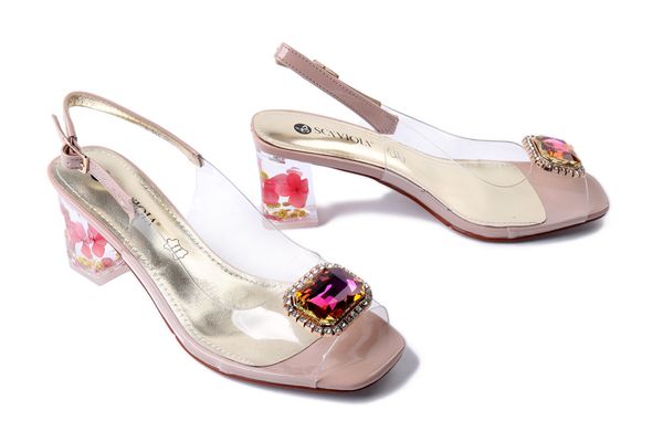 Eleganckie sandały. Wysokiej jakości silikon. Przezroczysty obcas. Skórzana wkładka. Stylowe ozdoby.