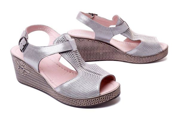 Sandały damskie. Naturalna skóra. Ażurowa cholewka. Miękka, skórzana wkładka. Zapięcie na klamerkę. Guma ściągająca. Wygodny koturn. Tęgość G.