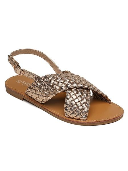 – zapięcie: sprzączka- noski: otwarte- powierzchnia: z metalicznym połyskiem – detale: plecionka- podeszwa: antypoślizgowa