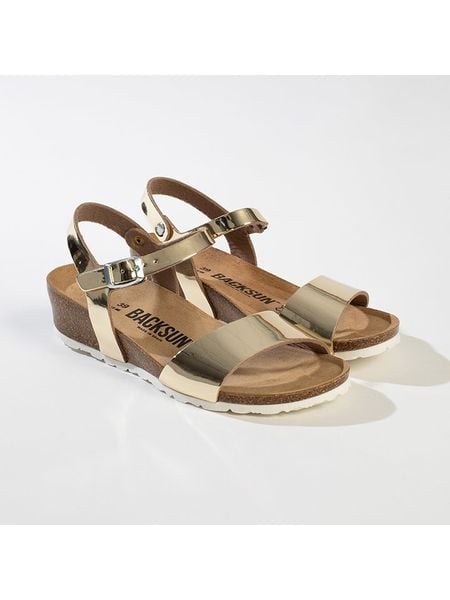 – zapięcie: sprzączka- noski: otwarte- powierzchnia: z metalicznym połyskiem – skórzana wkładka: ergonomicznie formowana- forma obcasa: koturny- podeszwa: antypoślizgowa- wyprodukowano w Hiszpanii