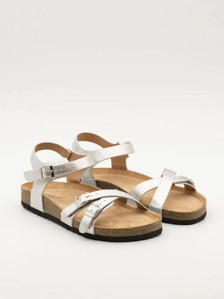 – zapięcie: sprzączka- noski: otwarte- powierzchnia: z metalicznym połyskiem- wkładka: ergonomicznie formowana- podeszwa: antypoślizgowa