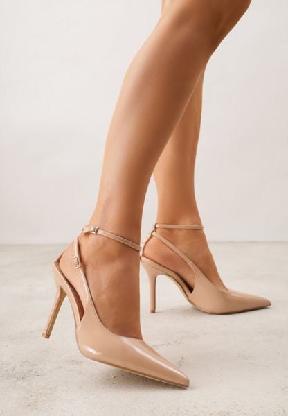 Ciemnobeżowe Lakierowane Sandały na Szpilce z Wycięciami i Paskami Guinemere