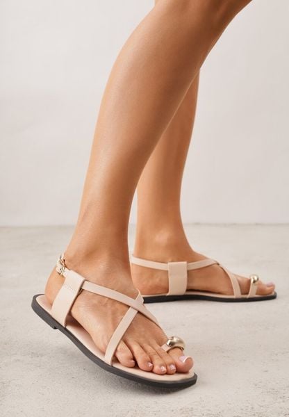 Beżowe Sandały Typu Japonki Ozdobione Metaliczną Aplikacją Grynyra