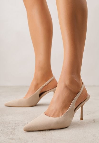 Ciemnobeżowe Sandały Slingback z Imitacji Zamszu na Szpilce z Noskiem w Szpic Delanoe
