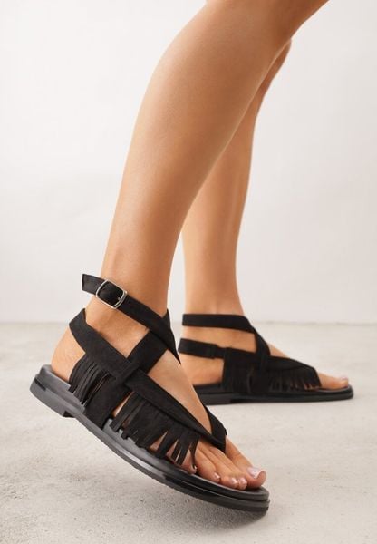 Czarne Sandały Typu Rzymianki Ozdobione Frędzlami Casasos