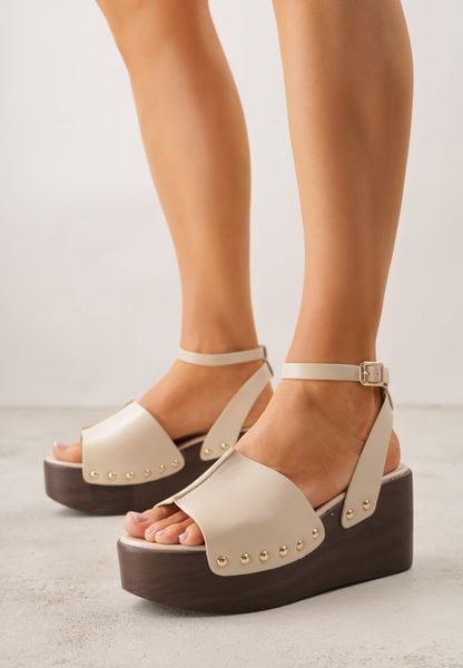 Beżowe Sandały na Koturnie i Platformie Ozdobione Nitami Rhethe