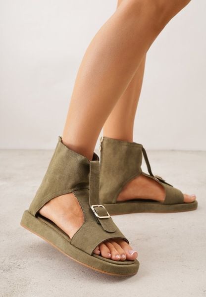 Zielone Sandały Typu Botki Ozdobione Metaliczną Klamrą z Przodu Adrasaia