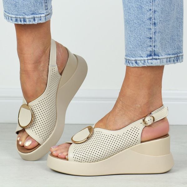 Beżowe skórzane sandały damskie na koturnie T.Sokolski L26-248