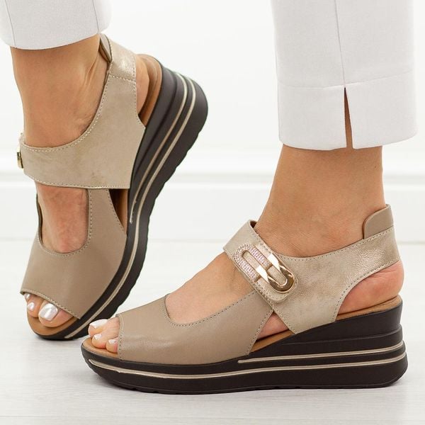 Beżowe skórzane sandały damskie na koturnie M.Daszyński 25144-1