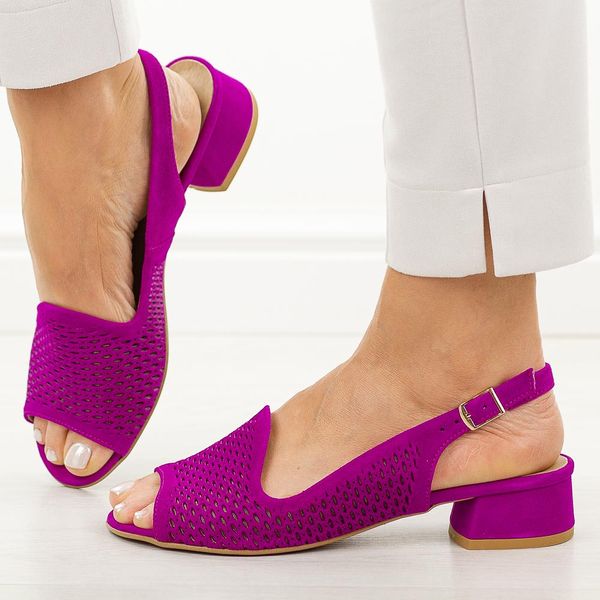 Fuksja ażurowe skórzane Polskie sandały damskie na obcasie Deoni D521C