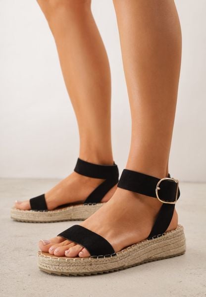 Czarne Sandały VICES z Ozdobną Klamrą i Jutową Platformą Riseth