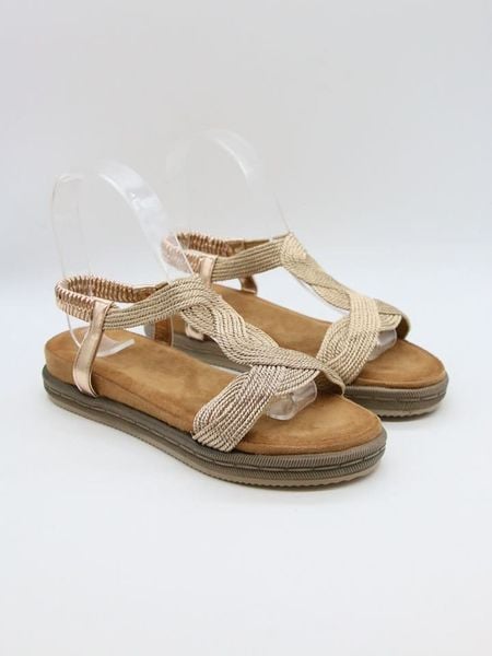 – zapięcie: bez- noski: otwarte- powierzchnia: z metalicznym połyskiem- detale: plecionka- podeszwa: antypoślizgowa