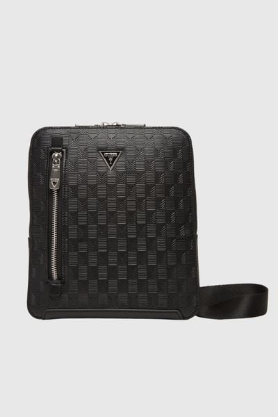 Czarna saszetka męska marki Guess, wykonana z wysokiej jakości skóry ekologicznej. Wyposażona w jedną komorę, jedną wewnętrzną kieszeń na zamek oraz trzy wsuwane kieszenie na karty. Dodatkowo posiada jedną kieszeń zapinaną na zamek z przodu i jedną niezapinaną z tyłu. Regulowany pasek zapewnia wygodę noszenia.