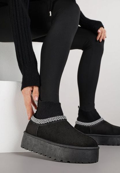 Czarne Wsuwane Śniegowce na Grubej Podeszwie z Ozdobnym Haftem i Niską Cholewką Serira