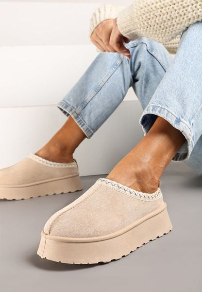 Beżowe Niskie Śniegowce z Imitacji Zamszu na Platformie z Ozdobnym Haftem Ftarvia