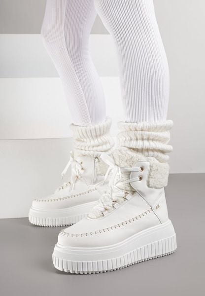 Białe Śniegowce na Grubej Podeszwie ze Sznurowaniem i Futerkiem Typu Baranek Miarion