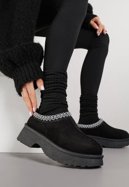 Czarne Wsuwane Śniegowce na Grubej Podeszwie z Ozdobnym Haftem i Niską Cholewką Serira
