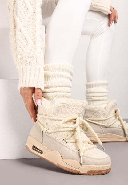 Beżowe Śniegowce na Płaskiej Podeszwie ze Sznurowaniem i Futerkiem Typu Baranek Salabira