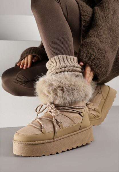 Ciemnobeżowe Śniegowce na Platformie Ozdobione Futerkiem Teswena