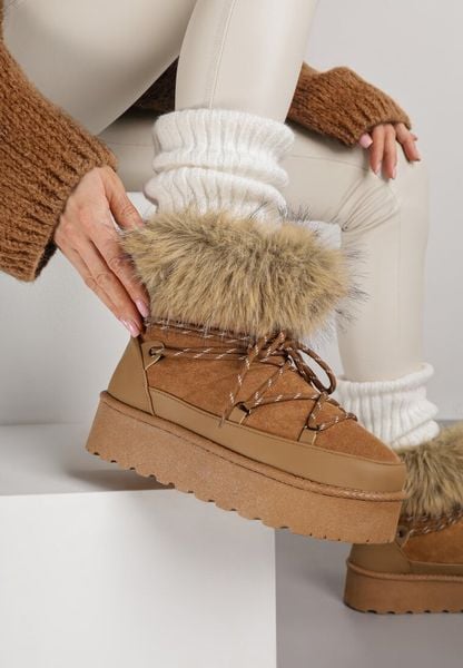 Jasnobrązowe Pikowane Śniegowce na Grubej Tłoczonej Podeszwie z Futerkiem Adarlia