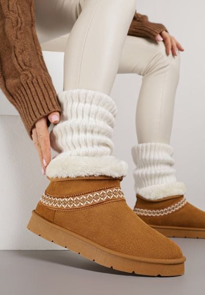 Brązowe Wsuwane Śniegowce z Imitacji Zamszu Zdobione Haftem i Futerkiem Zetesse