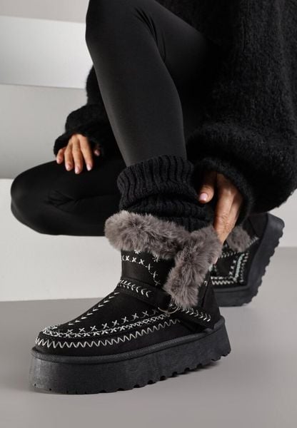 Czarne Śniegowce na Platformie z Futerkiem i Haftowanym Wzorem Celatusa