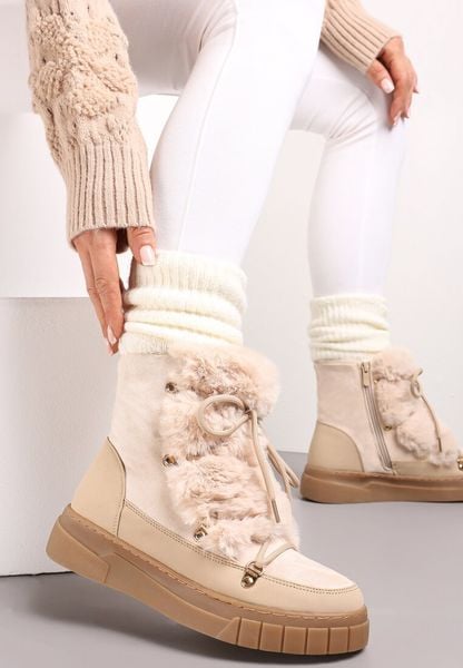 Beżowe Mocno Ocieplone Śniegowce z Futerkiem Wzdłuż Wiązania Avivina