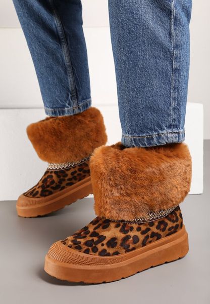 Brązowe Płaskie Śniegowce Ozdobione Wzorem w Panterkę Haftem i Futerkiem Linnealis