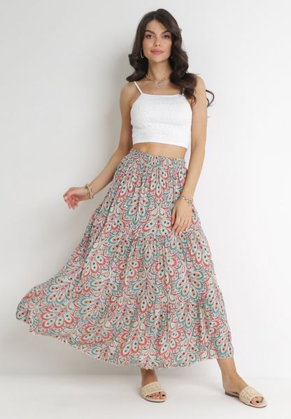 Wzorzysta spódnica Maizla wykonana w 100% z wiskozy. W talii wszyte cienkie, elastyczne gumki. Materiałowy pasek po bokach. Model o długości maxi i rozkloszowanym fasonie. Sprawdzi się w codziennych stylizacjach z sandałami czy klapkami.