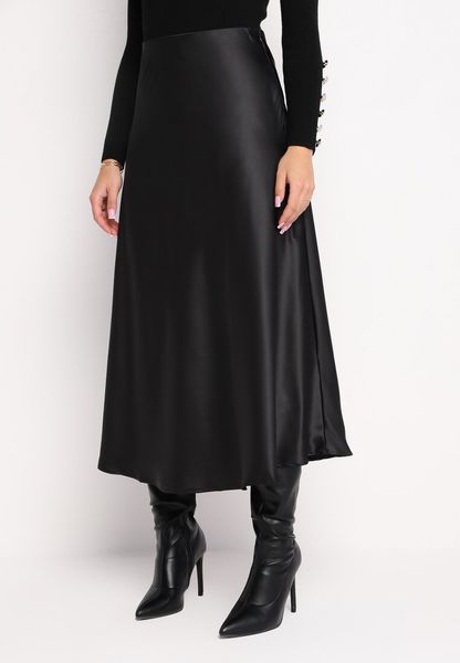 Czarna Rozkloszowana Midi Spódnica Satynowa Zapinana na Suwak z Gumką w Pasie Williwarne