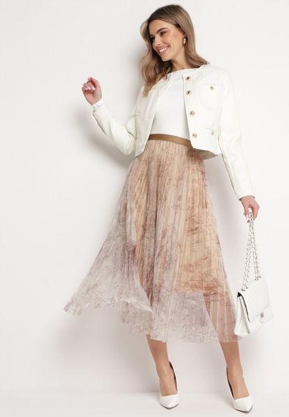 Beżowa Plisowana Spódnica Midi Ozdobiona Abstrakcyjnym Wzorem na Siateczce Estabia