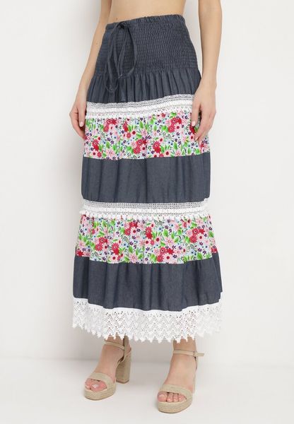 Granatowo-Biała Bawełniana Spódnica High Waist z Gumką w Talii i Ozdobną Koronką Tesaquin