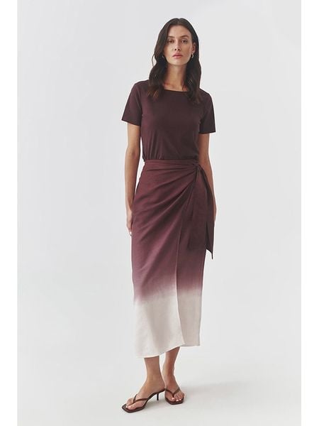 – wysokość pasa: high waist- krój: litera A- dolny brzeg: z rozcięciem- detale: ozdobny supełek- look: koperta- wzór: przejście kolorów