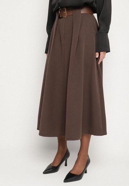 Brązowa Spódnica z Wiskozą o Rozkloszowanym Kroju z Paskiem z Klamrą Tiavela