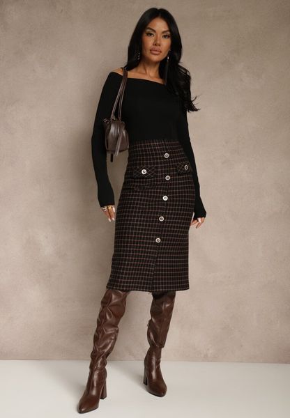 Czarna Tweedowa Spódnica Ołówkowa w Kratę z Guzikami Aretusa