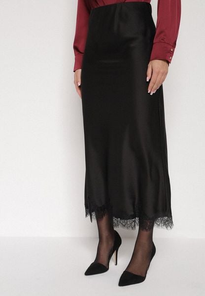 Czarna Satynowa Spódnica z Koronkowym Zdobieniem Silfera