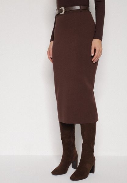 Brązowa Ołówkowa Spódnica z Wiskozą Zdobiona Rozcięciem i Paskiem Rowedela