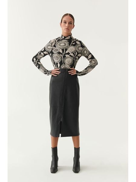 – wysokość pasa: high waist- zapięcie: suwak- dolny brzeg: z rozcięciem- krój: prosty- look: jednokolorowy, imitacja skóry