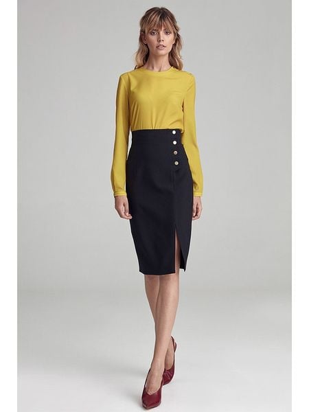 – wysokość pasa: high waist- zapięcie: bez- detale: ozdobne guziki- dolny brzeg: z rozcięciem- krój: wąski- look: jednokolorowy