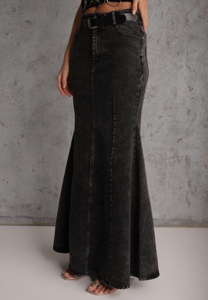 Czarna Spódnica Syrenka z Bawełny Jeansowa High Waist z Paskiem Appala